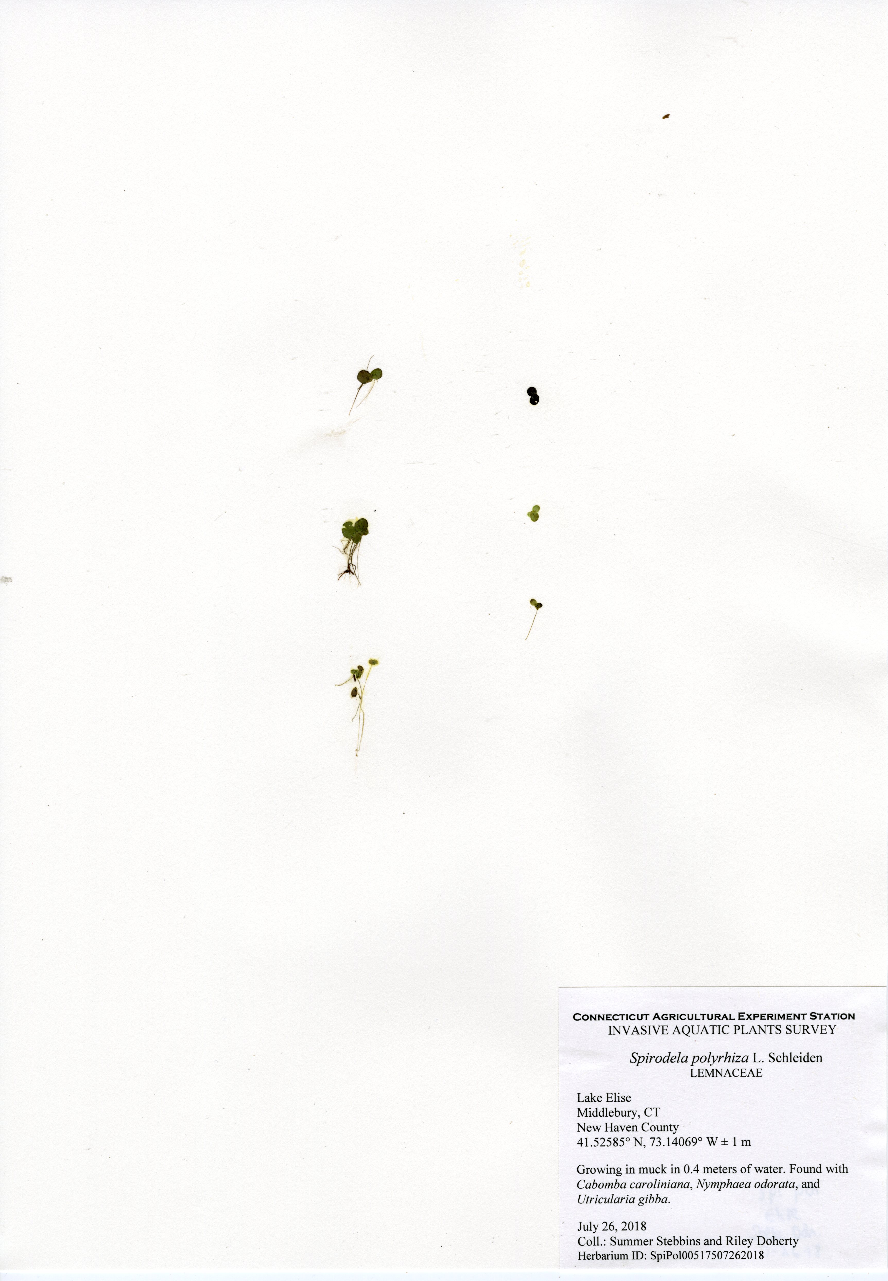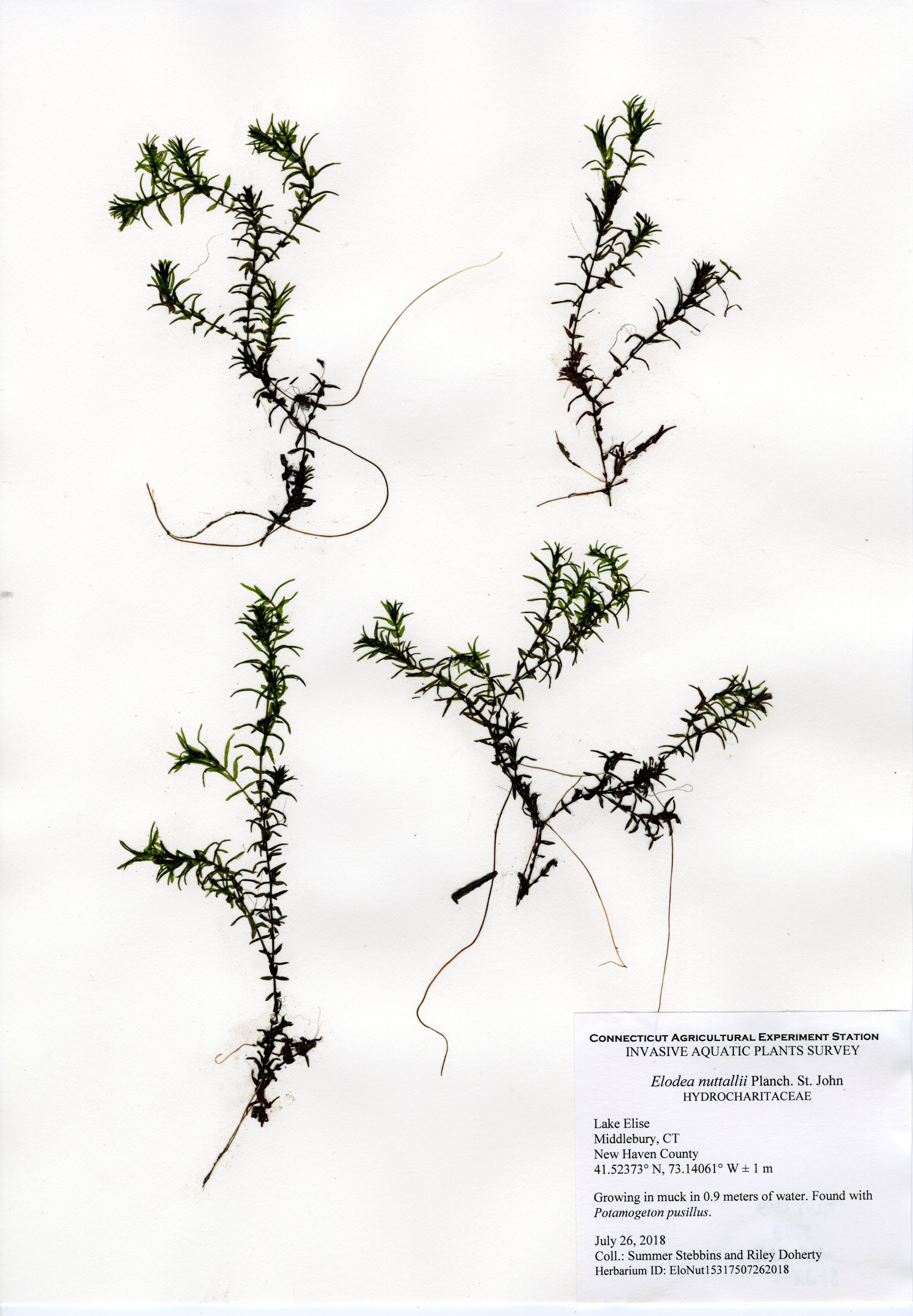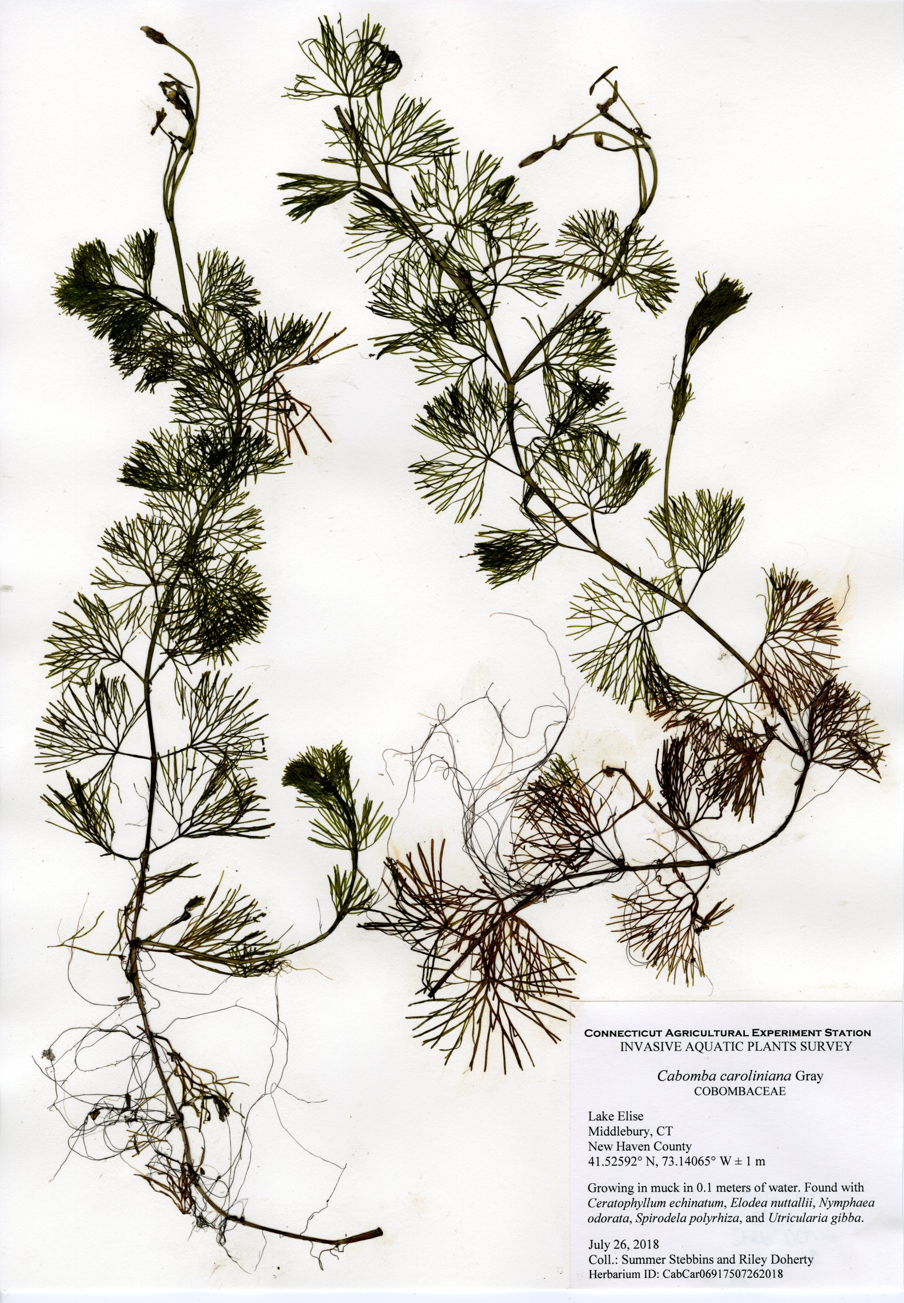 In 2018, CAES IAPP performed a resurvey of Lake Elise, the first survey done in 2011. Ten species were found, a decrease from fifteen in 2011. The same invasive species, fanwort (Cabomba caroliniana), was found in 2018, though at a much lower abundance. In 2011, it formed a thick ring around the entire perimeter, but in 2018 it was much patchier. Fanwort was still the dominant species in the lake, but the nine native species were more abundant in the northeastern portion of the lake. Overall, the aquatic plant abundance was less than found in 2011, with very little found along the western and southern perimeter.
