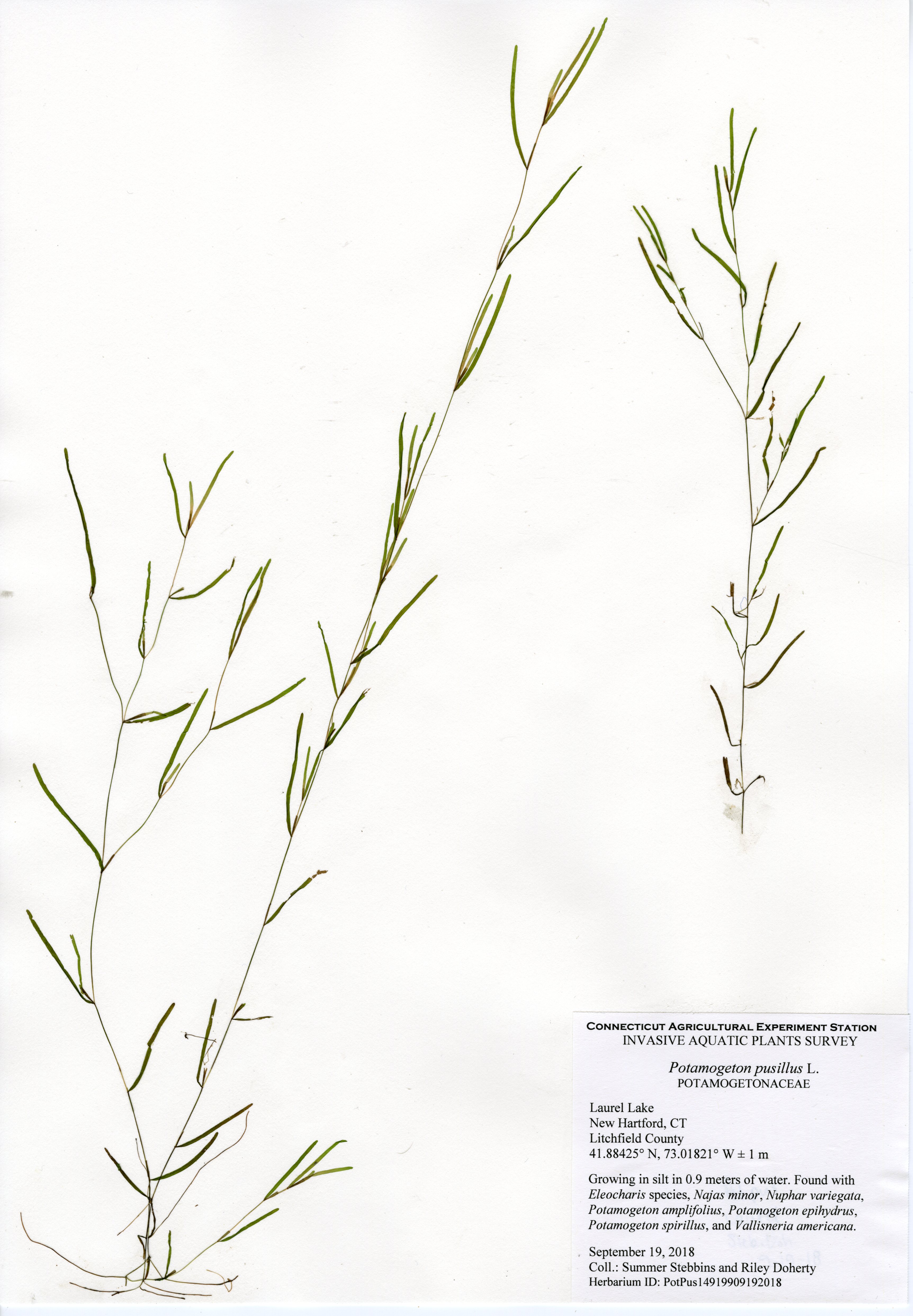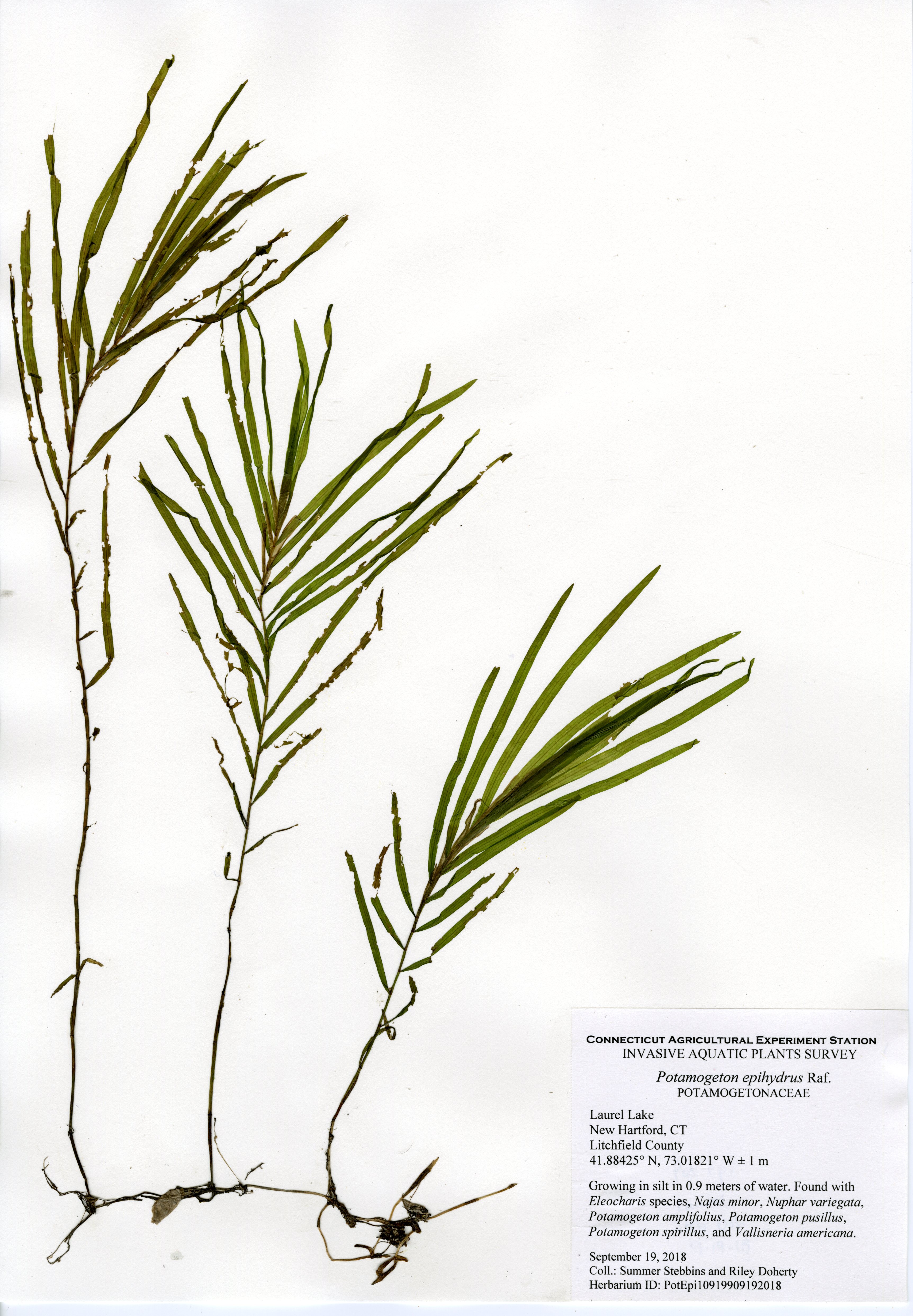 The CAES IAPP performed the third survey of the lake in 2018. The first survey was in 2012, the second in 2013. Compared to previous surveys, aquatic plant species were much less abundant. The same two invasive species were found, brittle waternymph (Najas minor) and phragmites (Phragmites australis), however less abundant. A new patch of phragmites was discovered near the dam at the northern end, and brittle waternymph was only found at the southern end of the lake.