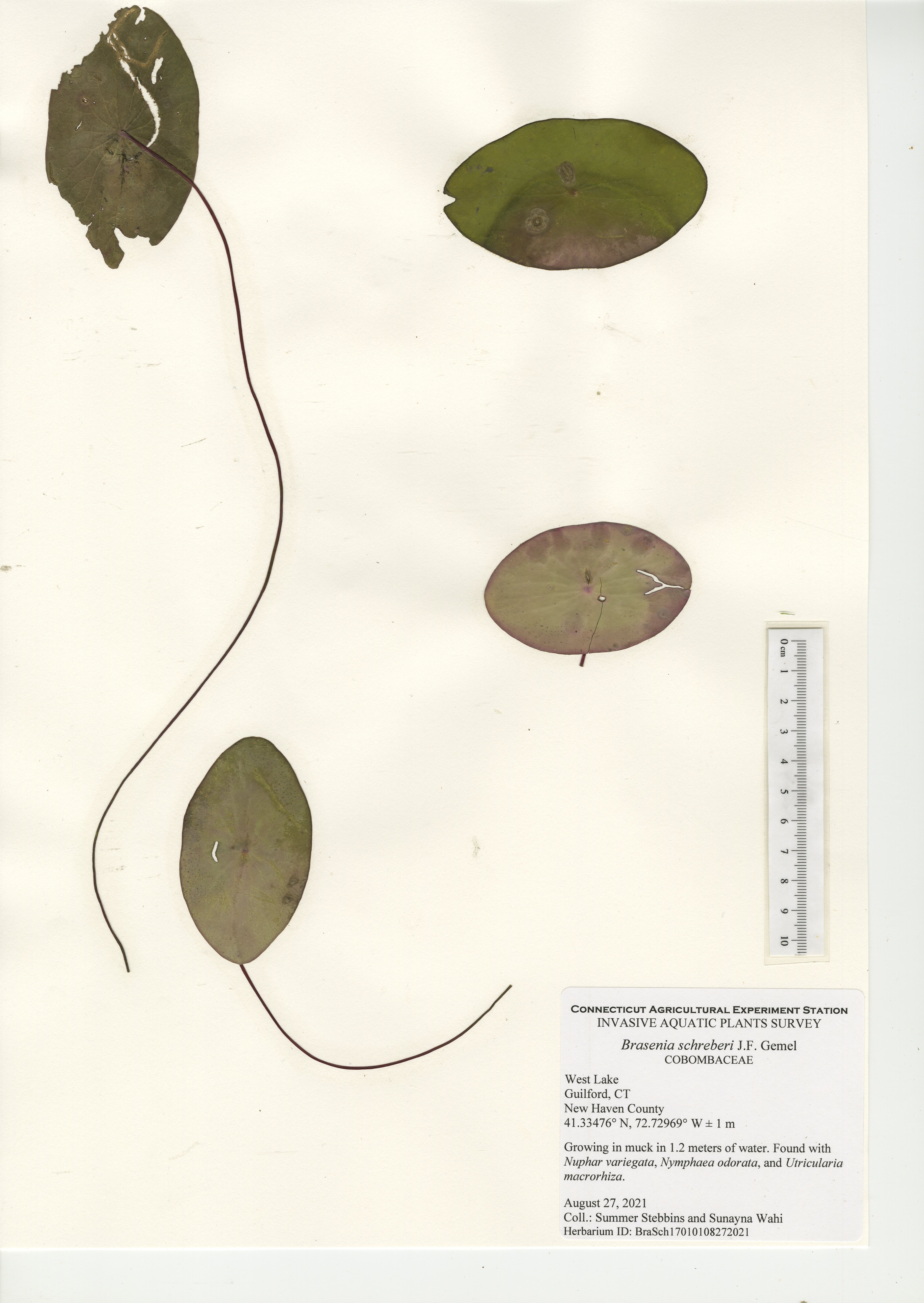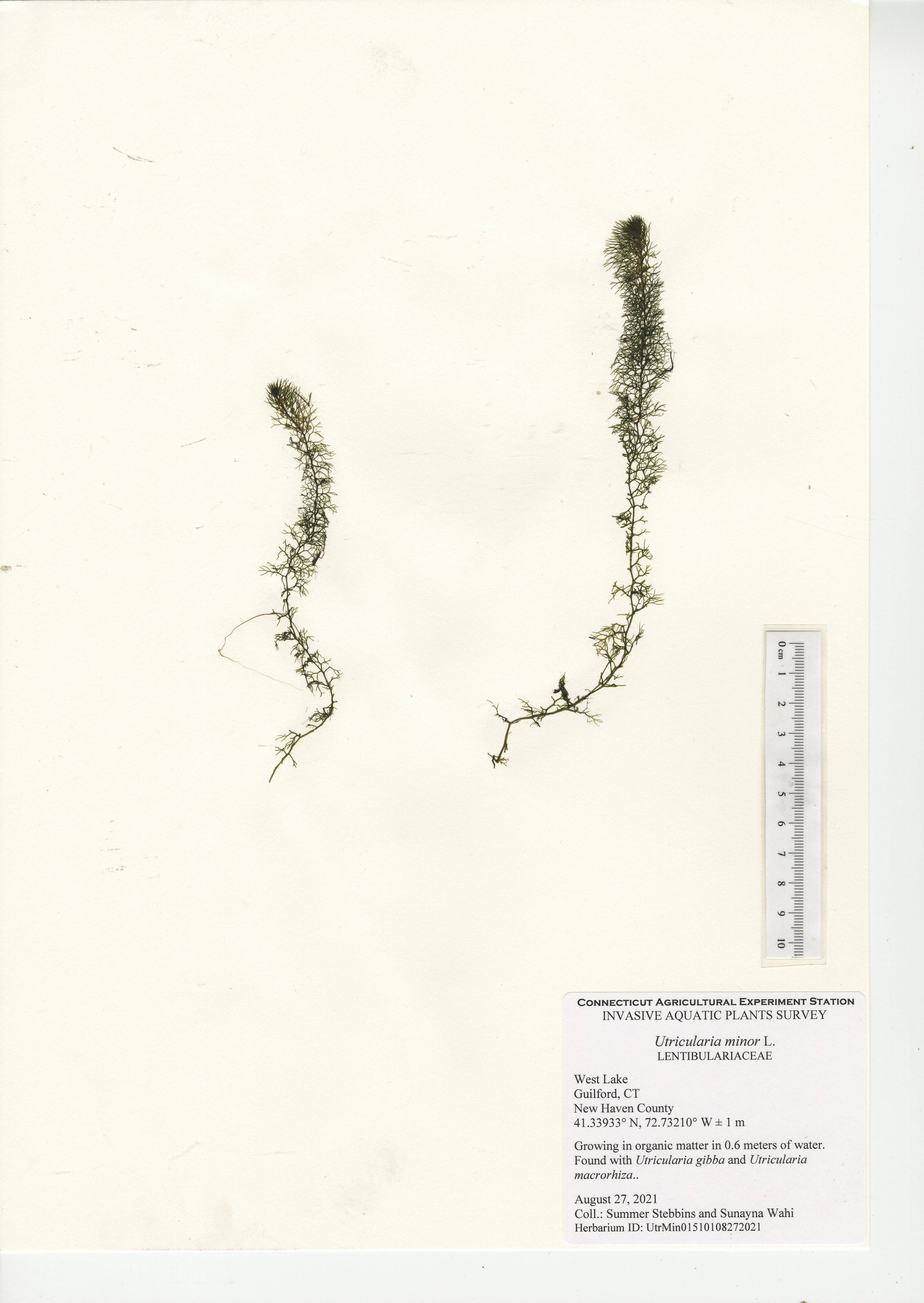 West Lake is a 52-acre lake located in Guilford, CT. The lake was surveyed for the third time in 2021 by CAES IAPP with the previous surveys occurring in 2005 and 2010. Nineteen native species were found in 2021, compared to 27 in 2010 and 18 in 2005. Minor naiad (Najas minor) was the only non-native invasive aquatic plant found during the 2005 and 2010 surveys; however, it was not observed during our 2021 survey. No invasive aquatic plants were therefore observed in 2021. This along with the decline in native species was likely caused by an aquatic herbicide application performed approximately a month prior to our survey. Two invasive non-aquatic wetland plants were found during the 2021 survey: phragmites (Phragmites australis) and purple loosestrife (Lythrum salicaria). Our documentation of non-aquatic plant species is outside the scope of CAES IAPP surveys and is performed at the discretion of the surveyor. Comparing their presence from survey-to-survey is therefore unreliable.
