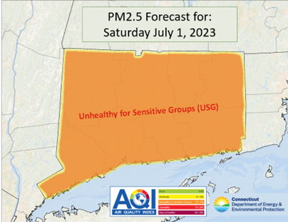 (HARTFORD)—Connecticut’s Department of Energy and Environmental Protection (DEEP) is expecting smoke from wildfires over Quebec to elevate fine particulate matter (PM2.5) levels on Saturday, July 1. These levels are expected to reach Unhealthy for Sensitive Groups (USG) levels for the entire state.The Connecticut Department of Public Health (DPH) also is issuing guidance and information on protective measures. Ozone levels (smog) are also expected to reach USG levels in Fairfield and New Haven counties.