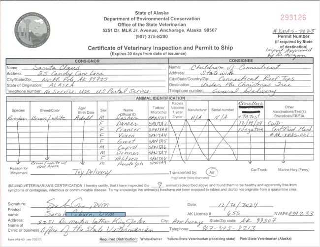(HARTFORD, CT) – Agriculture Commissioner Bryan P. Hurlburt and State Veterinarian Dr. Thamus Morgan announce that Santa Claus and his nine reindeer have received official approval to fly over Connecticut on December 24 to ensure the holiday magic continues without delay.