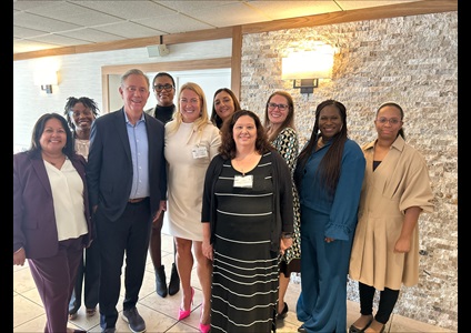 Karolina Wytrykowska (DMHAS) Committee Chair, Erica Blackmon (MIL), Talitha Coggins (DSS), Susan Cunningham (DCF), Valarie Lilley (DCF), Maribel Martinez (DCF), Kimberly Paluska (OEC), Jean Stack (DDS), Camise Turner-Evans (DMHAS) pictured with Governor Ned Lamont.
