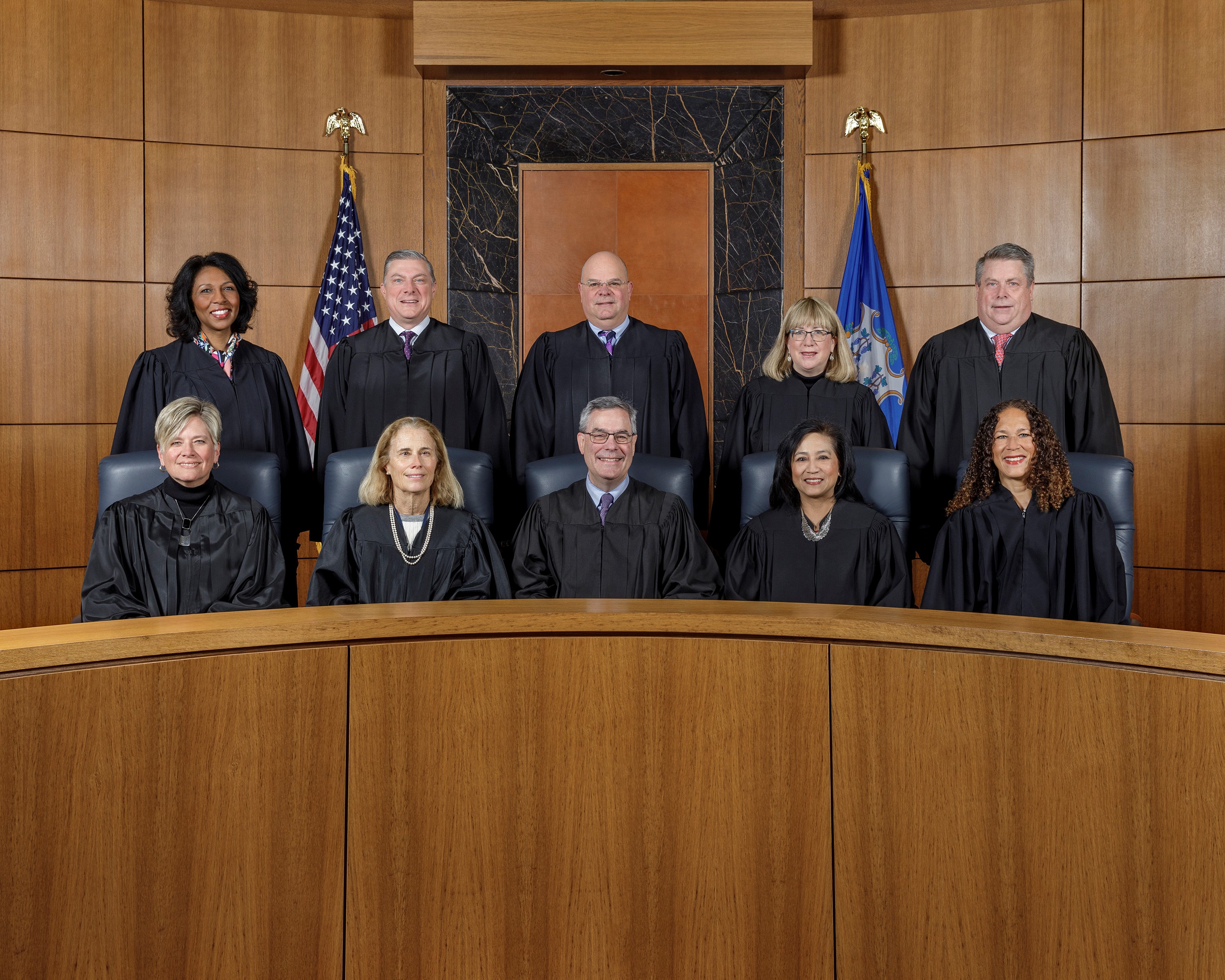 Standing from left to right: Justice Nora R. Dannehy, Justice Steven D. Ecker, Chief Justice Raheem L. Mullins, and Justice Joan K. Alexander; Seated from left to right: Justice Andrew J. McDonald, Chief Justice Richard A. Robinson (retired) and Justice Gregory T. D’Auria.